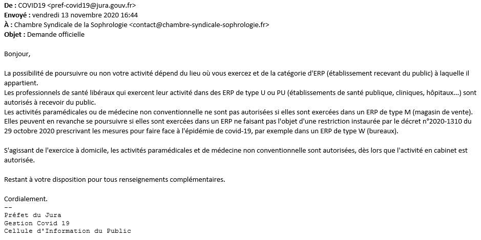 Le 06/11/2020, les organisations syndicales de la sophrologie, réunies en mouvement inter-syndical, ont écrit officiellement à chaque préfecture afin d’avoir leur position officielle sur la poursuite des activités des sophrologues (lire le courrier officiel).